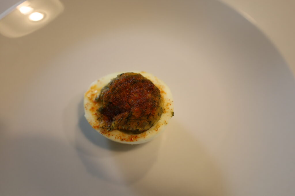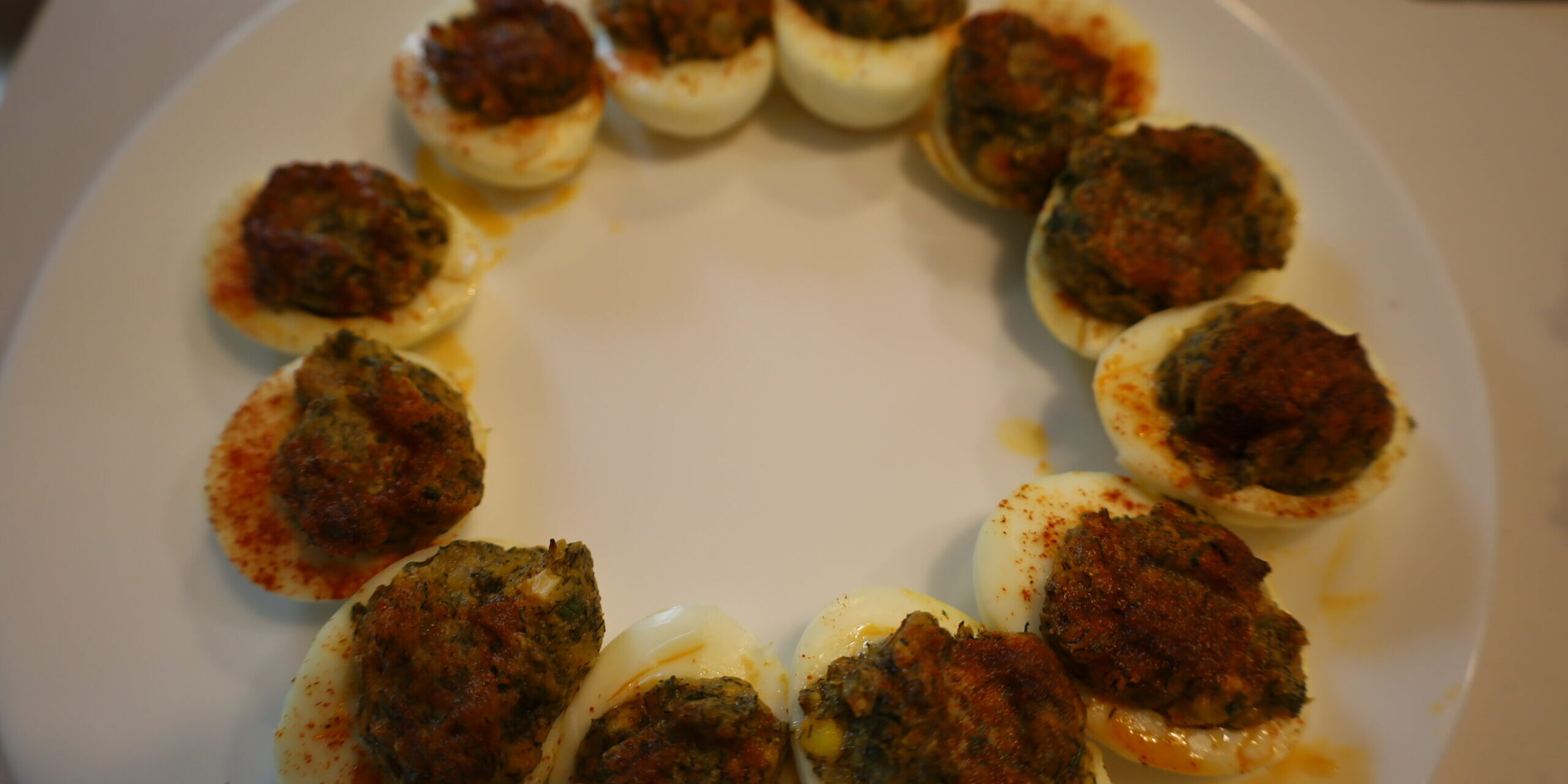 This receipe is my take on the receip found in the City Tavern Cookbook, which is excellent (https://www.amazon.com/dp/0762405295?ref_=ppx_hzsearch_conn_dt_b_fed_asin_title_1). I have never heard of stuffed eggs baked, this adds a great layer of flavor to this “stardard” appetizer and is a great guest pleaser.